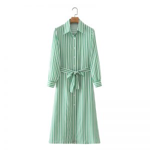 Hot Sale Women Turndown Collar Sashes Striped Shirt Midi Dress Female Long Sleeve Clothes Leisure Lady Loose Vestido D8096