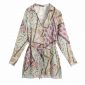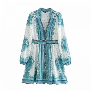 Vintage Women Placement Print Lantern Sleeve Mini Dress Female V Neck Single Breasted Clothes Casual Lady Loose Vestido D6372