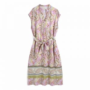 Summer Women Placement Print V Neck Sashes Side Slit Midi Dress Female Raglan Sleeve Clothes Casual Lady Loose Vestido D8151