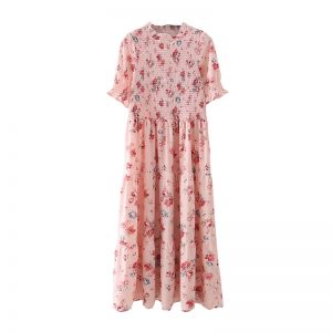 Summer Women Floral Printing Ruffled Collar Pink Midi Dress Female Short Sleeve Clothes Leisure Lady Loose Vestido D7926