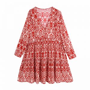 Hot Sale Women Geometric Print V Neck Red Mini Dress Female Nine Quarter Sleeve Clothes Casual Lady Loose Vestido D8208