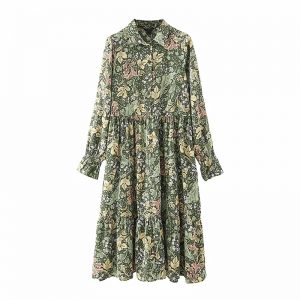 Autumn Women Green Leaf Printing Loose Midi Dress Female Turndown Collar Long Sleeve Clothes Casual Lady Vestido D6782