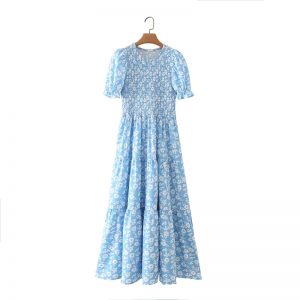 Summer Women Floral Print Tiered Ruffle Midi Dress Female Puff Sleeve Clothes Leisure Lady Slim Vestido D7931