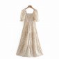 Summer Women Square Collar Elastic Bust Printed Midi Dress Female Puff Sleeve Clothes Casual Lady Loose Vestido D7712