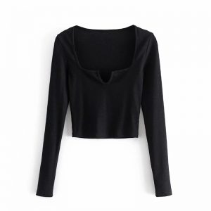 New Spring Women Square Collar Black Knitting Short T Shirt Casual Femme Long Sleeve Slim Crop Tops T1390