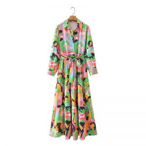 Hot Sale Women Digital Print Sashes Tiered Ruffle Shirt Dress Female Long Sleeve Clothes Casual Lady Loose Vestido D8336