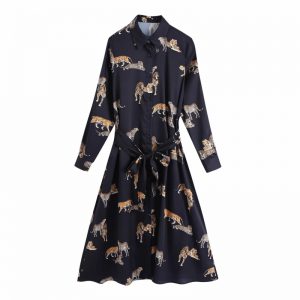 Women Tiger Print Sashes Turndown Collar Shirt Dress Female Long Sleeve Loose Clothes Casual Lady Vestido D6692