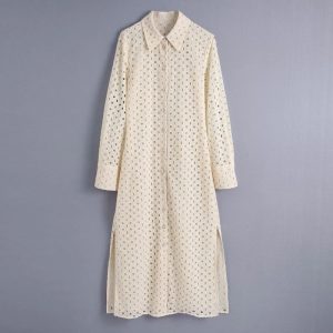 Summer Women Hollow Embroidery Side Slit Midi Shirt Dress Female Long Sleeve Clothes Leisure Lady Loose Vestido D8037