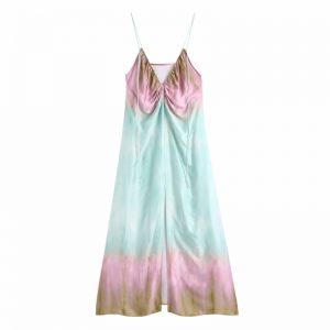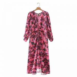 Summer Women Flower Printing Pleated Three Quarter Sleeve Midi Dress Female Clothes Leisure Lady Loose Vestido D7993