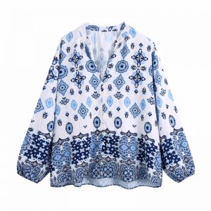 Hot Sale Women Placement Print Stand Collar Loose Shirt Female Lantern Sleeve Blouse Casual Lady Tops Blusas S9206