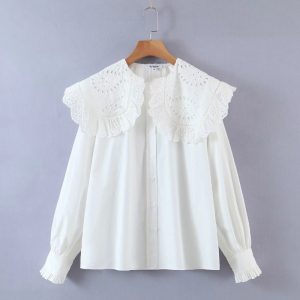 Women Hollow Embroidery Turndown Collar White Shirts Female Long Sleeve Blouses Casual Lady Loose Tops Blusas S8277
