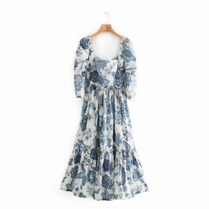 Women Flower Printing Three Quarter Sleeve Dress Casual Female Square Collar Loose Clothes Lady Vestido D6380